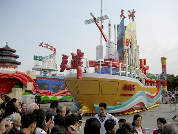 我公司制造的慶祝國慶60年“渤海號”彩車經過天安門前,經受黨和國家領導人檢閱